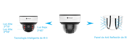 Desarrollado por Milesight y aplicado por primera vez en la Cámara de Red AI 12X Mini Domo PTZ, el diseño antirefleción de IR adopta paneles elaborados para eliminar por completo las preocupaciones del reflejo de IR, lo que garantiza que la cámara ofrezca la mejor función de IR. Y la suprema la Tecnología Inteligente de IR II con combinación de luces altas y bajas liberará su rendimiento IR incomparable.